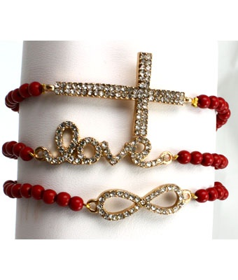 3 PC Beaded Bracelet Set: Crystal Cross, "Love" & Infinity Connectors beaded on stretchy bracelet.